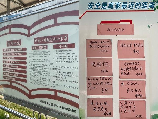 創(chuàng)新打造“廉建+”文化品牌,將廉潔教育融入項目日常。設(shè)立“清風(fēng)宣傳欄”,定期更新中央紀委最新反腐動態(tài)、行業(yè)廉政新規(guī),配以簡明解讀,從“制度約束”到“價值認同”,以文化軟實力筑牢思想防線;建立“廉潔承諾墻”,上傳與家屬的合影,并將廉潔承諾手寫上墻,以“小家”撬動“大家”,用情感紐帶將“他律”轉(zhuǎn)化為“自律”。